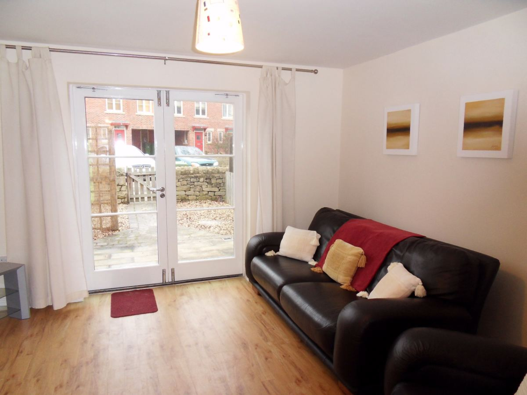 Wood effect laminate floor covering, wall mounted radiator and French doors allowing for access onto the rear garden, under stairs storage cupboard.