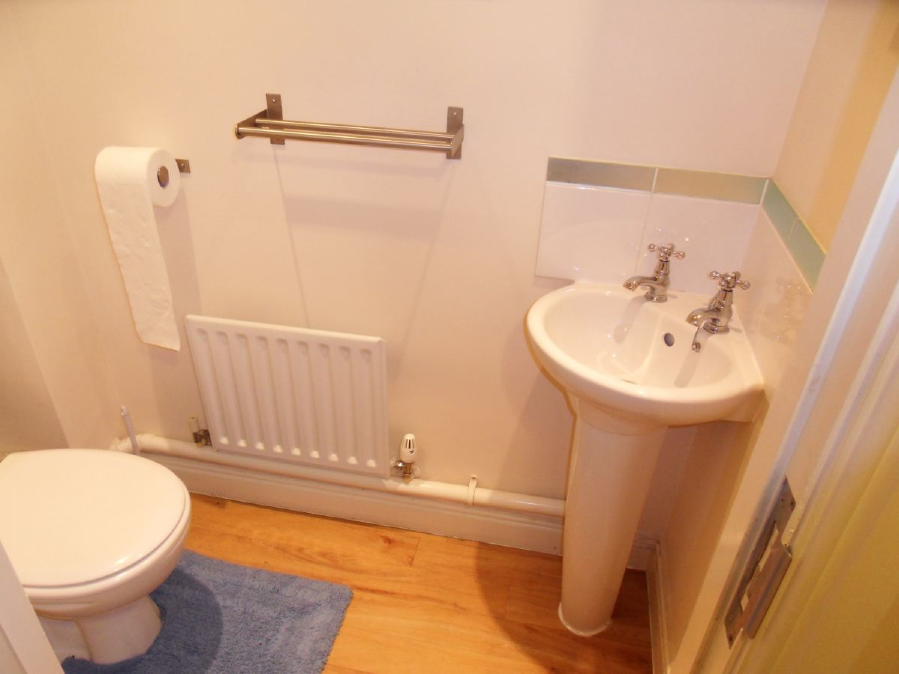 With low level WC, pedestal wash hand basin with tiled splashbacks, wall mounted radiator and extractor fan to ceiling.